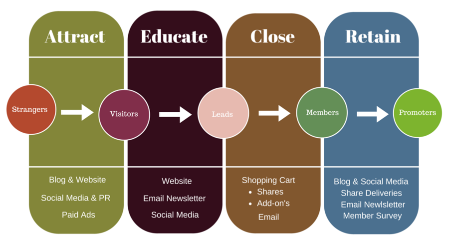 We find it's good to make a list of possibilities in a table under each heading (Attract, Education etc.) and sub-heading (Blog & website, Social Media etc.) then review it with our team or mentor. It's different for every community. Since it's our mission to support farms in becoming more profitable, help people eat better, and strengthen food communities, feel free to reach out 1-866-542-4305 or email to review your ideas list and we can share what works for farms in our community and here at Taproot Farms (Fun fact: Taproot has grown from 50-500 members and sells all shares within a few weeks every year). You're welcome to just call, or if you would like to share your ideas list first, you can schedule a meeting here:
