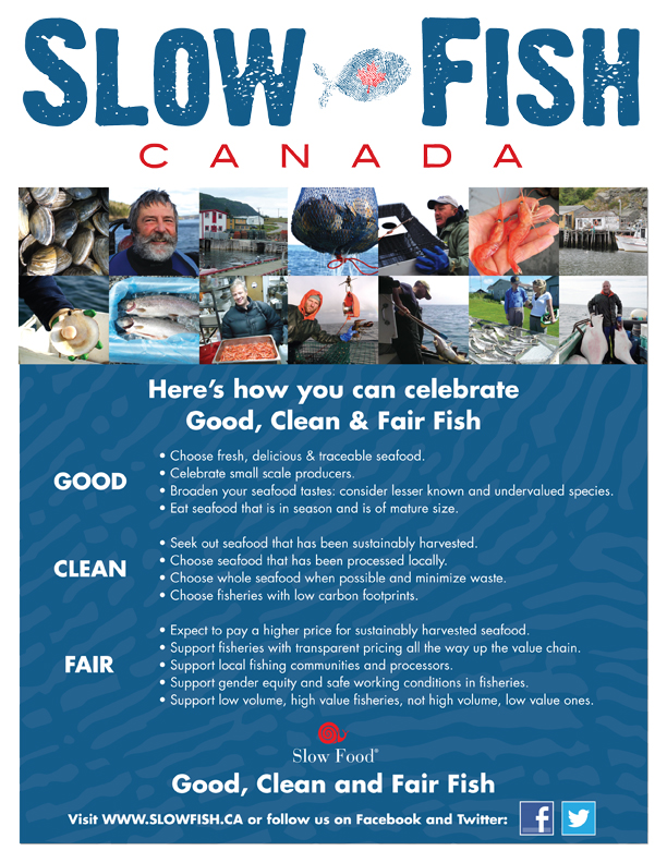 The Slow Food approach is based on three tenets: food that is good, clean; fair; says Dave Adler of Nova Scotia's Ecology Action Centre. The same is true of Slow Fish. We hope to support, discover, and celebrate Canada's small scale, sustainable fisheries by connecting people who eat seafood to the people who catch it, harvest it, and grow it.