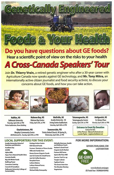 "My main message for the people in Nova Scotia is that 80 per cent of the food in the grocery store is contaminated with engineered ingredients," says Vrain. "Soy beans, canola, corn, cotton seed oil, sugar beets. Those crops, engineered to be tolerant of herbicides are then sprayed with [herbicides like] Round Up." Read more...