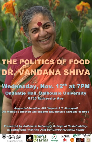 Vandana Shiva is in town for Food Secure Canada conference and she is doing a talk on"The Politics of Food" on November 12th at 7pm at Ondaatje Auditorium, Dalhousie University. Suggested donations: $20 (waged), $10 (unwaged).
